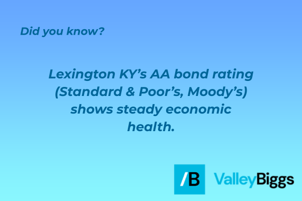 - Lexington, KY is a strong business hub in the Bluegrass region. It has over 17,000 acres of land for growth and supports many sectors like bourbon, horse farms, and manufacturing. The city’s AA bond rating (Standard & Poor’s, Moody’s) shows steady economic health.